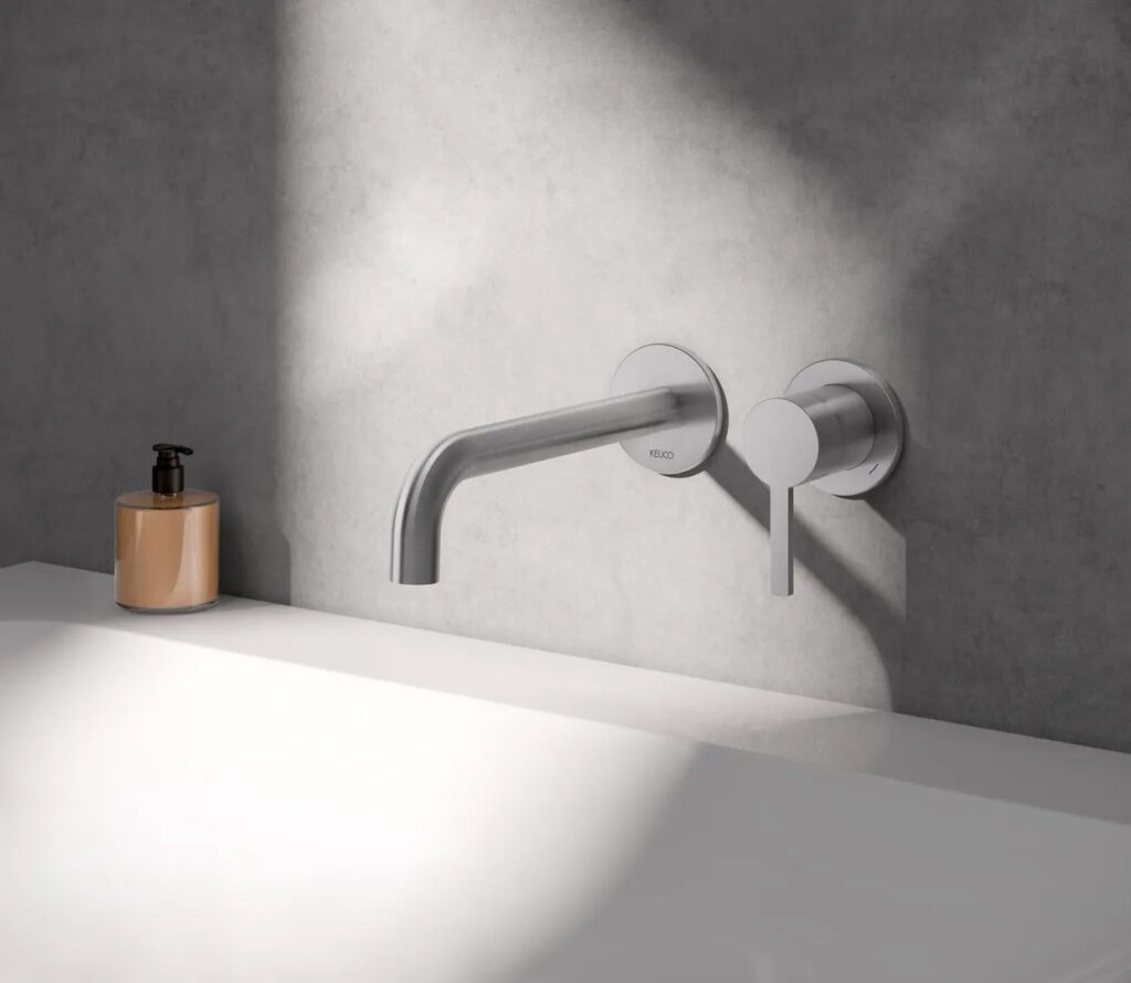 Filigrane PLAN blue Wandauslaufarmatur sorgt für Klarheit am Waschtisch